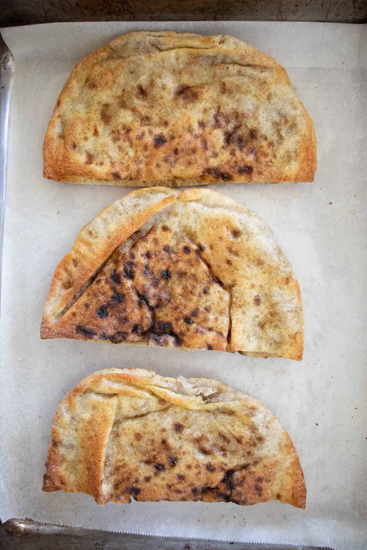 - On a cookie sheet, add a layer of parchment paper. Place bread pieces onto the cookie sheet pan with the thicker side of the bread facing down. Baladi bread has a thin side and a thick side, the thin side should face upwards.