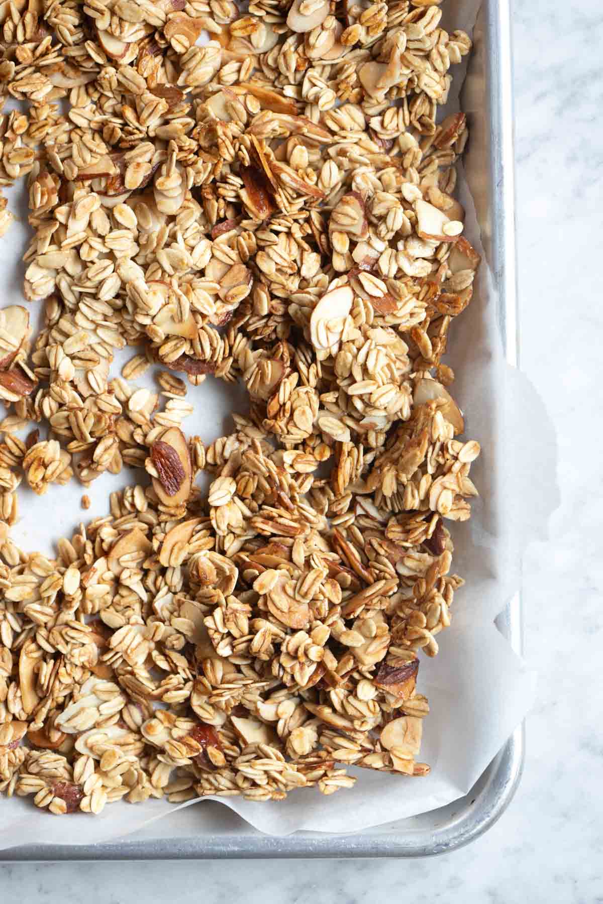 For big granola clusters, allow the baked granola to cool on the baking sheet for about 15 minutes. This helps the granola to clump together. Once the granola reaches room temperature, pour it into your favorite storage containers.